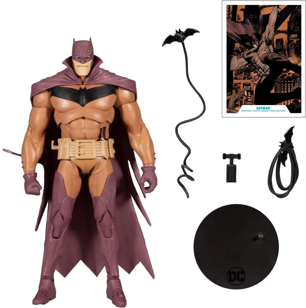 Batman is based on the comic book Batman: White Knight #5 (Comics 2018) Batman is featured as a red cover variant from Batman: White Knight Includes collectable art card with red Batman: White Knight on front, and character biography on the back Batman comes with Grapnel Launcher, Batarang with line, wrapped Batarang with line, and a base Showcased in DC themed window box packaging