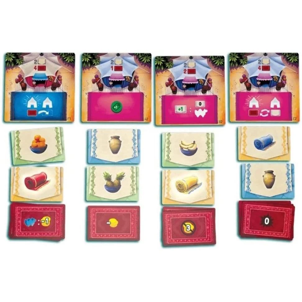 In the new game of Camel Up: Off-Season, you and up to four other players will have access to their caravan of four different camels And what do camels do other than race? They carry And these special camels can carry lots of goods. Whether it be fruits, carpets, vases or something else that is likely to smash or go everywhere when you drop it! These markets will be filled up with cards, and when that deck runs out after your camels being busy at work – whoever has the most money at the end of the game wins! English Version | Ages 8+ | 3-5 Players | 45 Minutes Playing Time