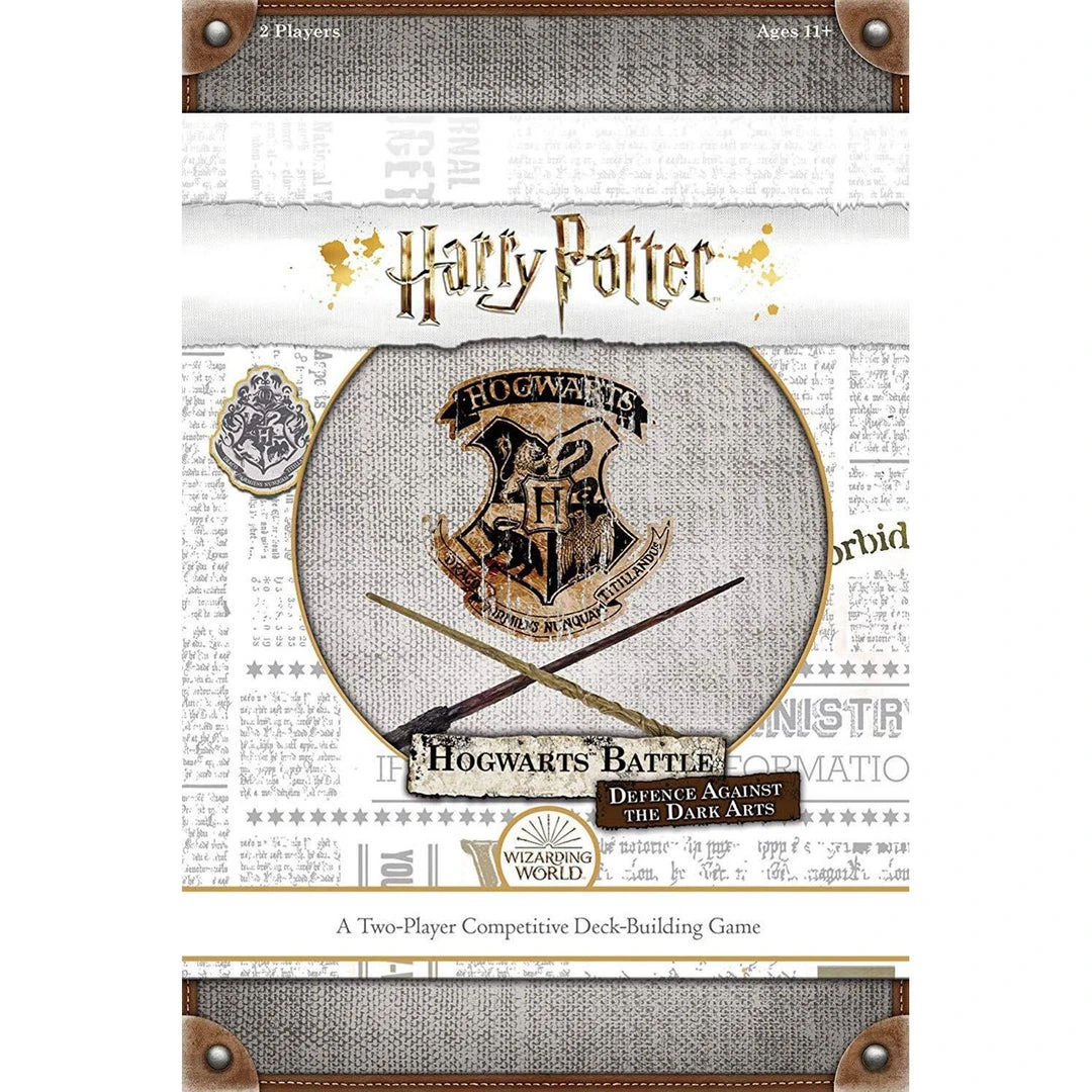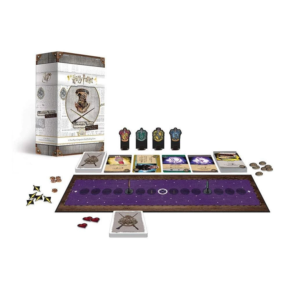 Harry Potter™ Hogwarts Battle™ Defence Against the Dark Arts is a competitive deck-building game for two players that is inspired by Harry Potter Hogwarts Battle. In this fast-paced game, players take turns playing cards, taking actions and acquiring new cards to build a more powerful deck as their defensive skills improve. Stun your opponent three times to win! 2-player competitive game for fans of Harry Potter and Hogwarts Battle. Build an unstoppable deck to take down your opponent. Includes: 1 Practice Mat Game Board 4 Oversized House Cards 8 House Movers 2 Mover Bases 24 Starting Cards (14 Spells, 4 Items, 6 Allies) 31 Hex Cards 129 Hogwarts Cards (72 Spells, 35 Items, 22 Allies) 5 Stun Tokens 30 Chip Pieces (14 Influence Tokens, 8 Attack Tokens, 8 Health Tokens) Rules For 2 Players 45 Minutes Play Time For Ages: 11+