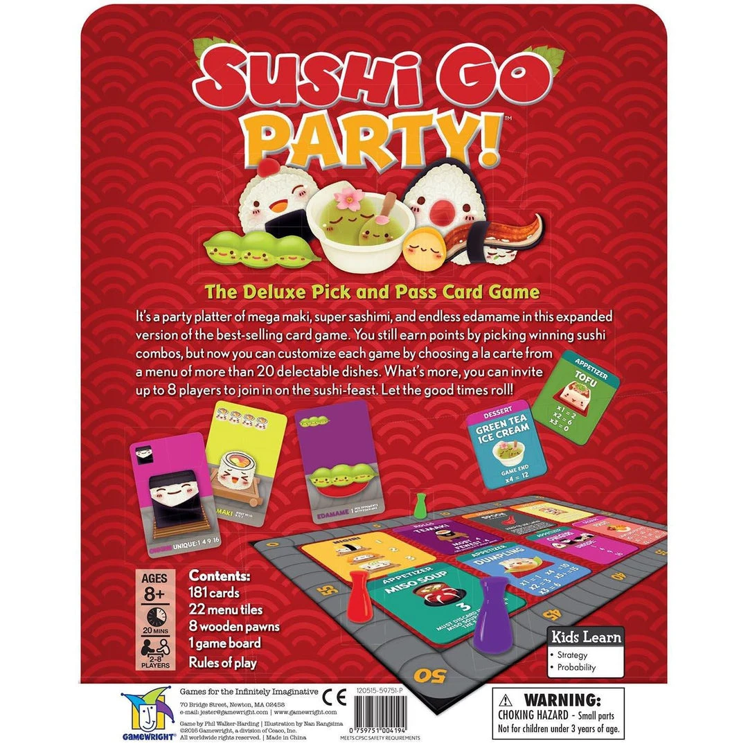 It’s a party platter of mega maki, super sashimi, and endless edamame in this expanded version of the best-selling card game You still earn points by picking winning sushi combos, but now you can customise each game by choosing a la carte from a menu of more than 20 delectable dishes The variety of cards offers many new opportunities You’ll need to change your strategy from game to game depending on the menu you have choosen Suitable for 2-8 players aged 8 and above